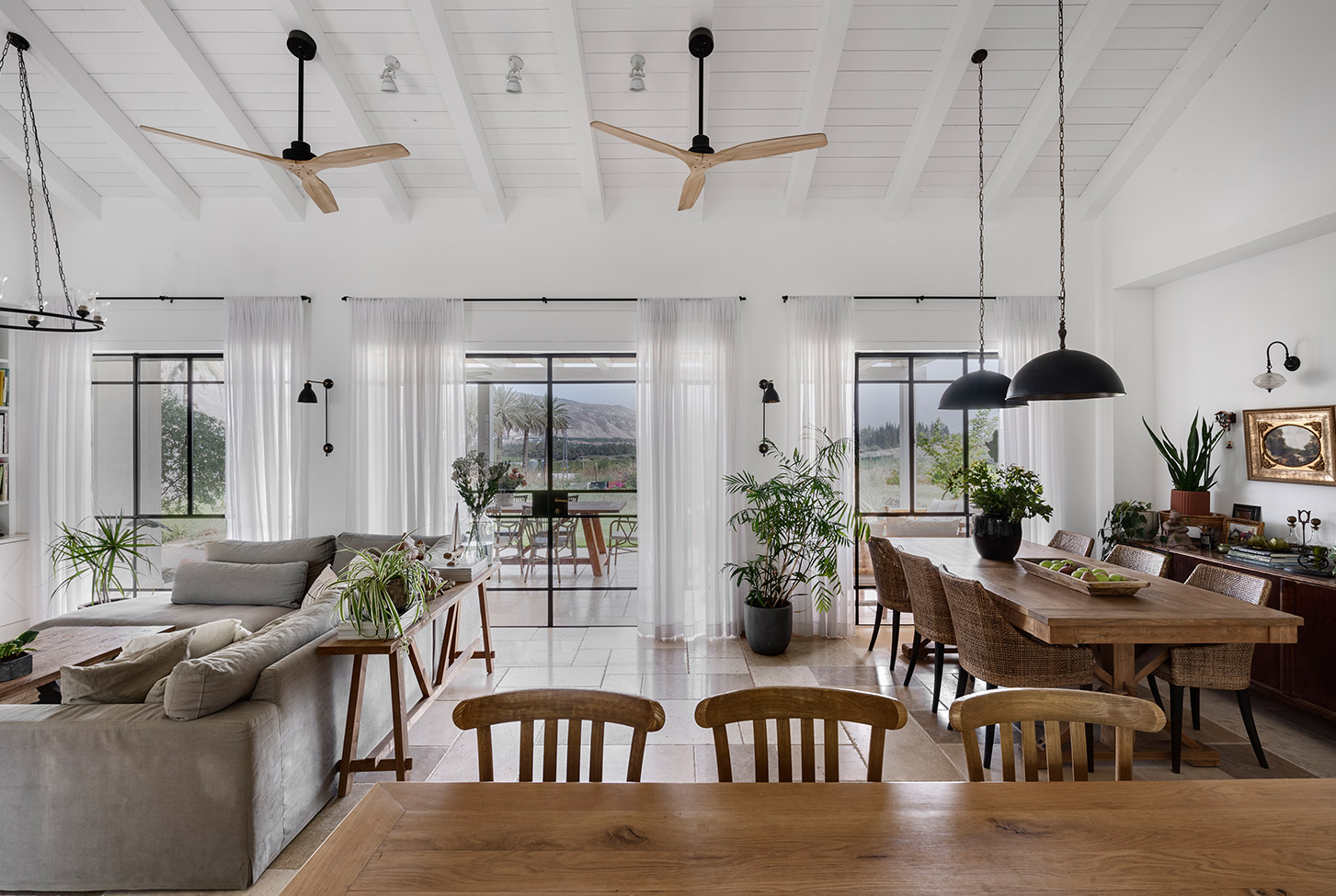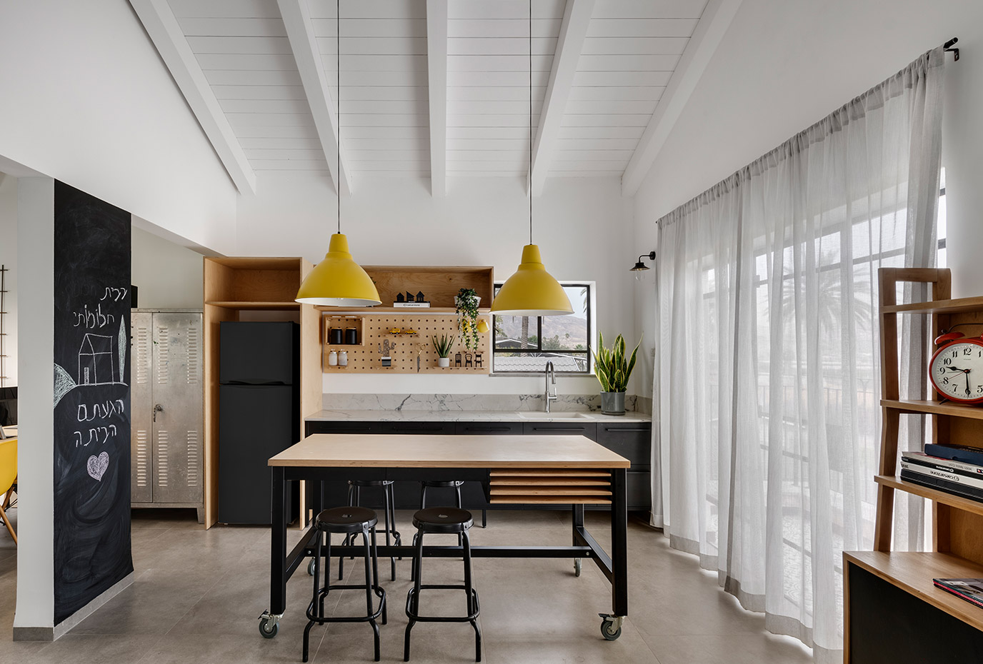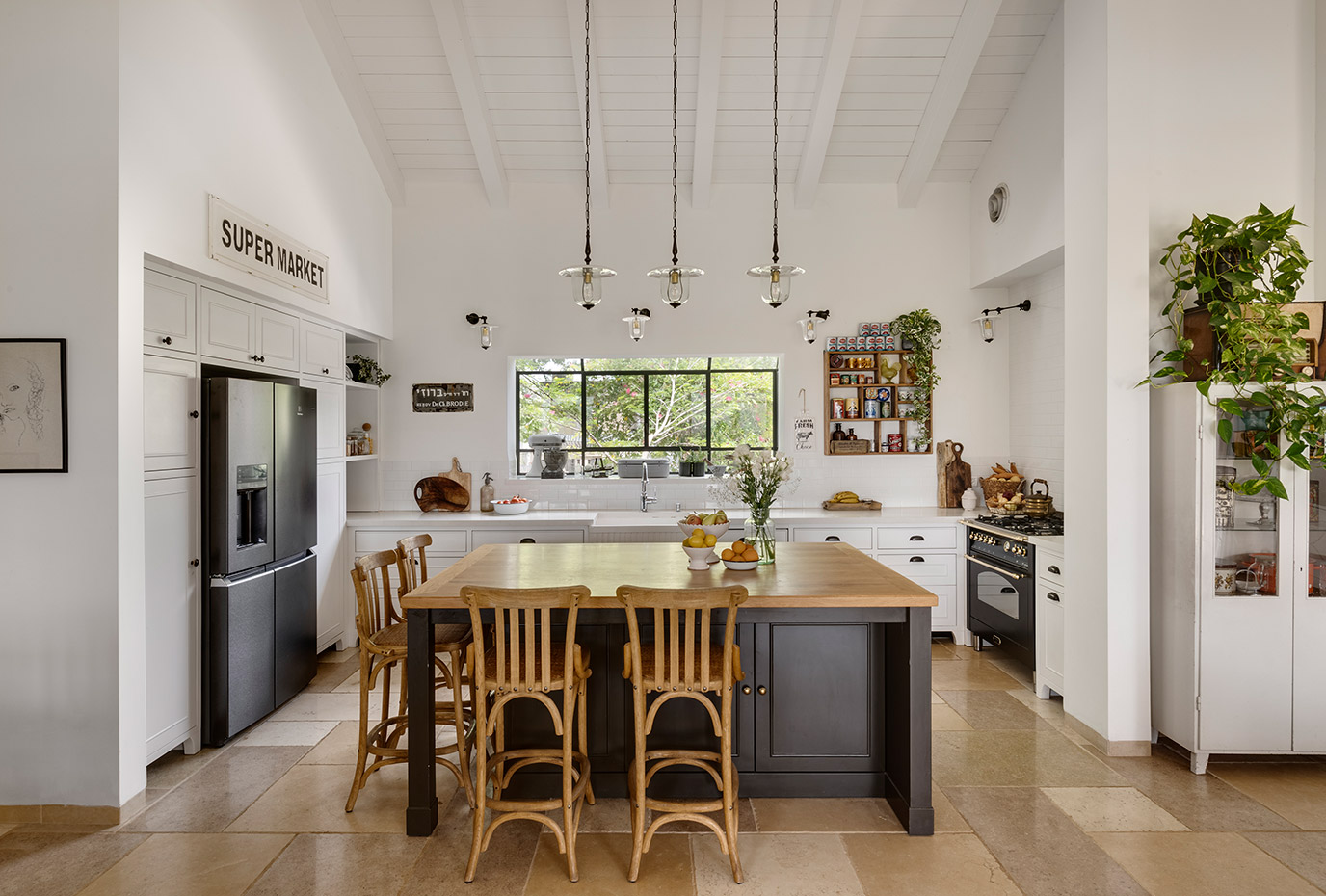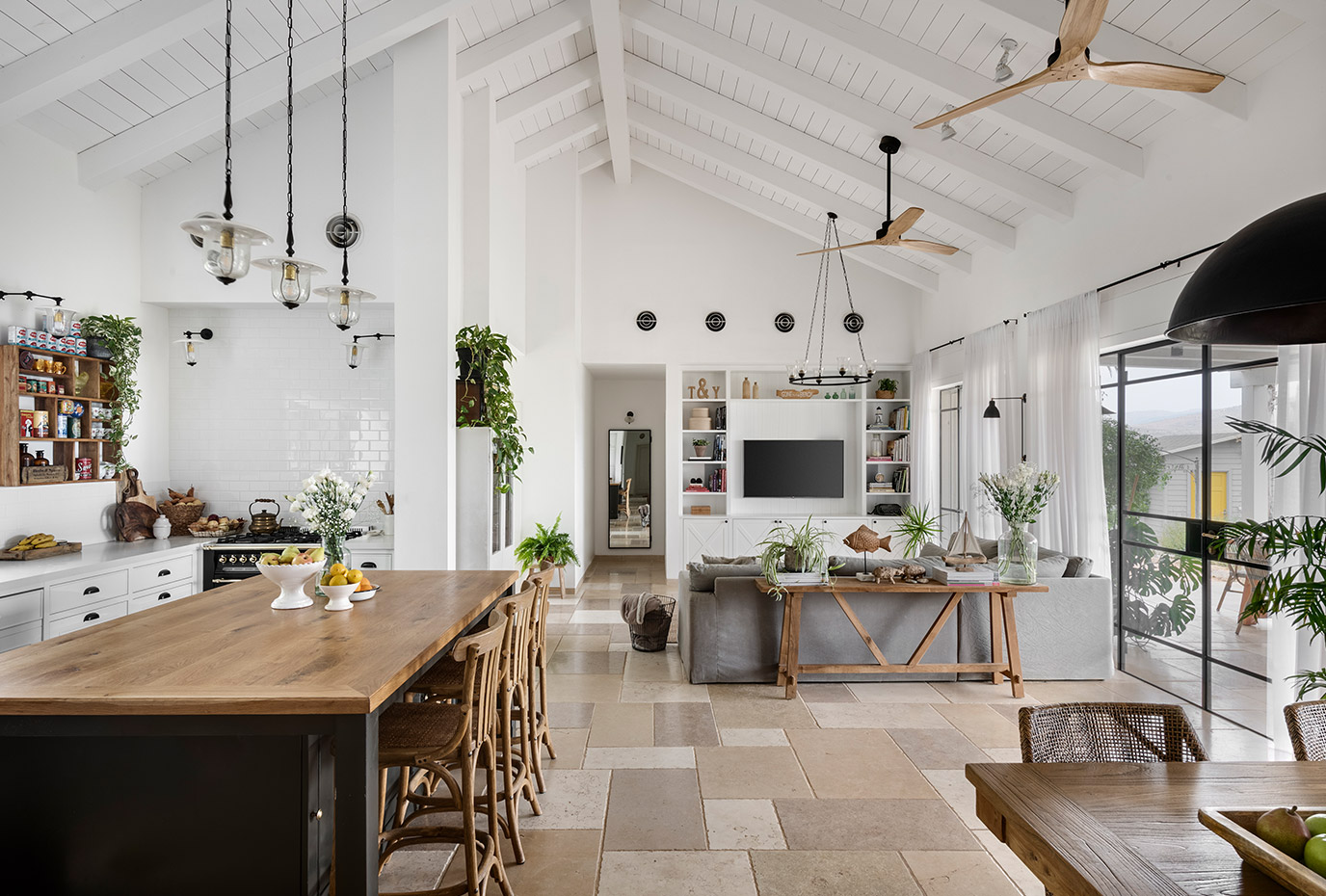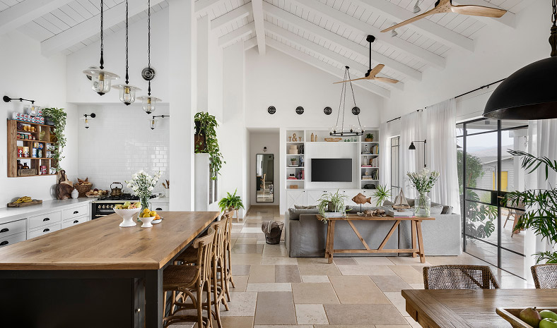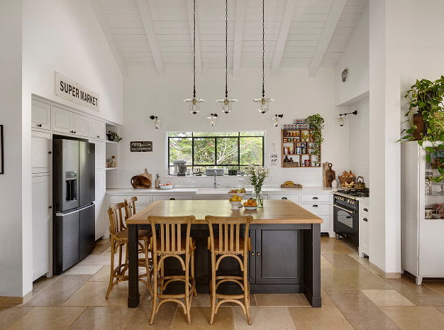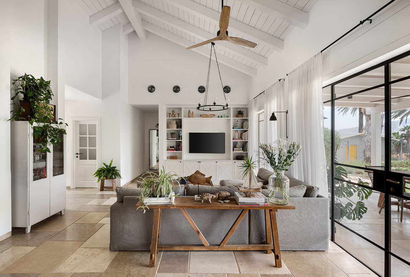 בתכנון היה לנו חשוב להשתמש בחומרים טבעיים, שהזמן עושה להם טוב והם מתיישנים בצורה יפה וטבעית: רצפת האבן הקרירה, תקרת העץ הגבוהה והבהירה המרחיבה לנו את הלב והנפש, חלונות הברזל ופרקט העץ הטבעי שבחדרי השינה.