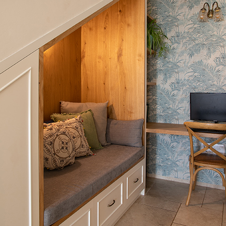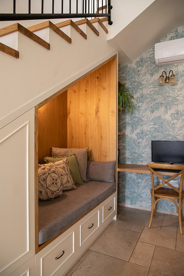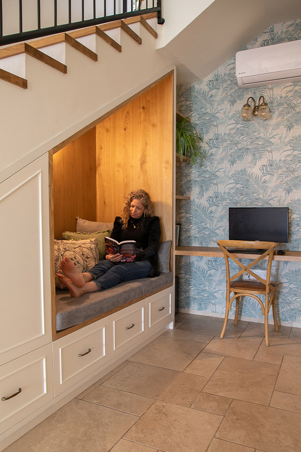 גרם המדרגות, הפך למוקד של תכנון יצירתי עם פתרונות אחסון ופינת עבודה.